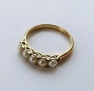 Hübscher Verlobungsring 3 kt runder Schliff weiße Perle fünf Steine 14 K Gelbgold FN CHF 68,32CHF 136,64