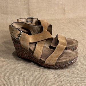 Sofft Damen-Keilsandalen Größe 8,5 hellbraun Wildleder Riemchen Plateau gewebter Absatz Schnalle