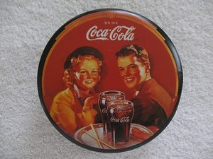 1988 Black Coca Cola Round Tin Can Young Couple Serving Tray w 2 Glasses of Coke
