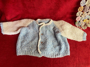 Handgestrickter Babypullover mit Druckknopfverschluss Baby blau und weiß