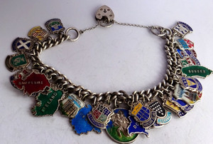 Traumhaftes Vintage massiv Silber Bettelarmband & 30 Silber & Emaille Reiseschilde