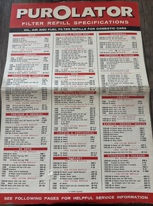 Vintage Purolator Filter Refill Spezifikationen Referenztabelle für 1960