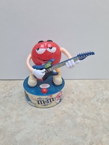 Roter M&M Rockstar Gitarrenspieler spielt Musik mit Batterien tanzt nicht