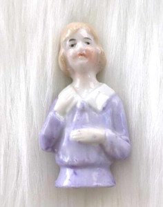 Vintage Porzellan Half Doll Nadelkissen Top 20er Jahre Stil Frauen in Lavendel 2 Zoll