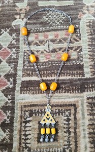 Vintage silberfarbene ethnische Stammeshalskette jemenitischer Faturan Bernstein Bakelit 26 Zoll lang
