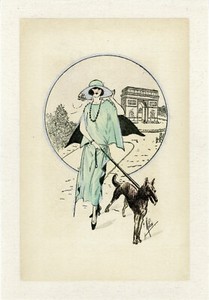 "ÉLÉGANTE promenant son CHIEN à l'ARC DE TRIOMPHE" Planche originale entoilée