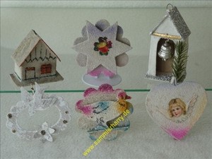 6 Teile böhmischer Papp-Christbaumschmuck, Veniziascher Tau, beglimmert, 5D229-2