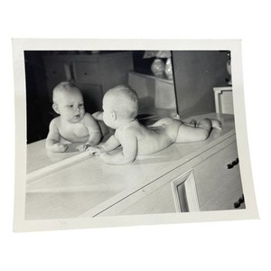 Vintage 50er Jahre Foto Baby Spiegel Reflexion Kommode Szene Innen kuriose Pose