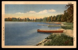 Postkarte See mit Booten am Ufer, Loogootee, Indiana