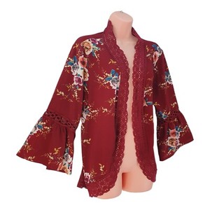 Damen rot Blumen Kimono Strickjacke Spitzenbesatz Glockenärmel vorne offen Gr. XL
