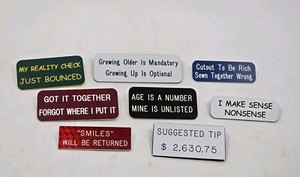 Vintage lustig graviert Kunststoff Pinbacks Pins Witze Flair ideal für die Arbeit! Riegel