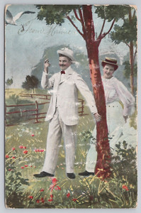 Postkarte Just My Style, Mann flirtet mit Frau im weißen Kleid und ausgefallenem Hut Vintage CHF 4,76