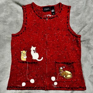 Vintage Full Zip Pullover Weste Damen Medium rot bestickt Katzen Oma 90er Weihnachten