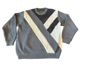 Vintage Sachsen Pullover Herren Large Leder Design Strukturstrick Grau Geometrisch