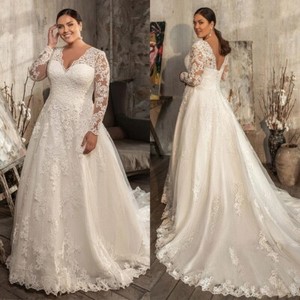Plus Size A-Line Wedding Dresses V-Neck Long Sleeved Sweep Train Bridal Gowns