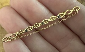 Vintage Brosche goldfarben Stabstil durchbrochen zarte Kette blaue Steine Anstecknadel