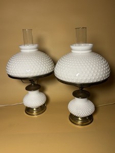 2 Vintage MCM Hobnail Milchglas Hurricane 2-Wege elektrische Lampen mit Kamin