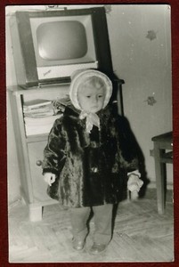 Vintage Foto 1960 Ein kleines Mädchen im Pelzmantel steht vor einem alten Fernseher