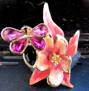 Vintage Bob Mackie Trembler Blume Biene Emaille & Kristall Pin signiert 2,25"