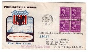 #824 Presidential Series 19c Rutherford B. Hayes 1938 FDC - Multnomah