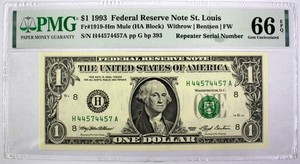 PMG-66 1993 1 $ FEDERAL RESERVE NOTE ST LOUIS - REPEATER SERIAL H44574457A